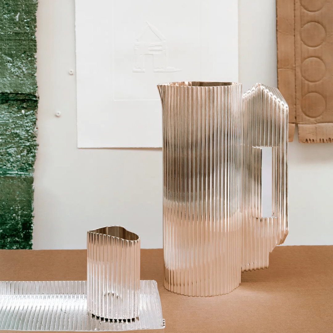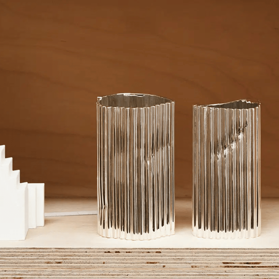Intitulée “Silver Set 2025”, la collection s’inspire des textures et des volumes du carton ondulé, matériau simple et éphémère que l’artiste érige en œuvre d’art. Transposé dans l’argent massif, il devient un motif, un relief et une lumière.
