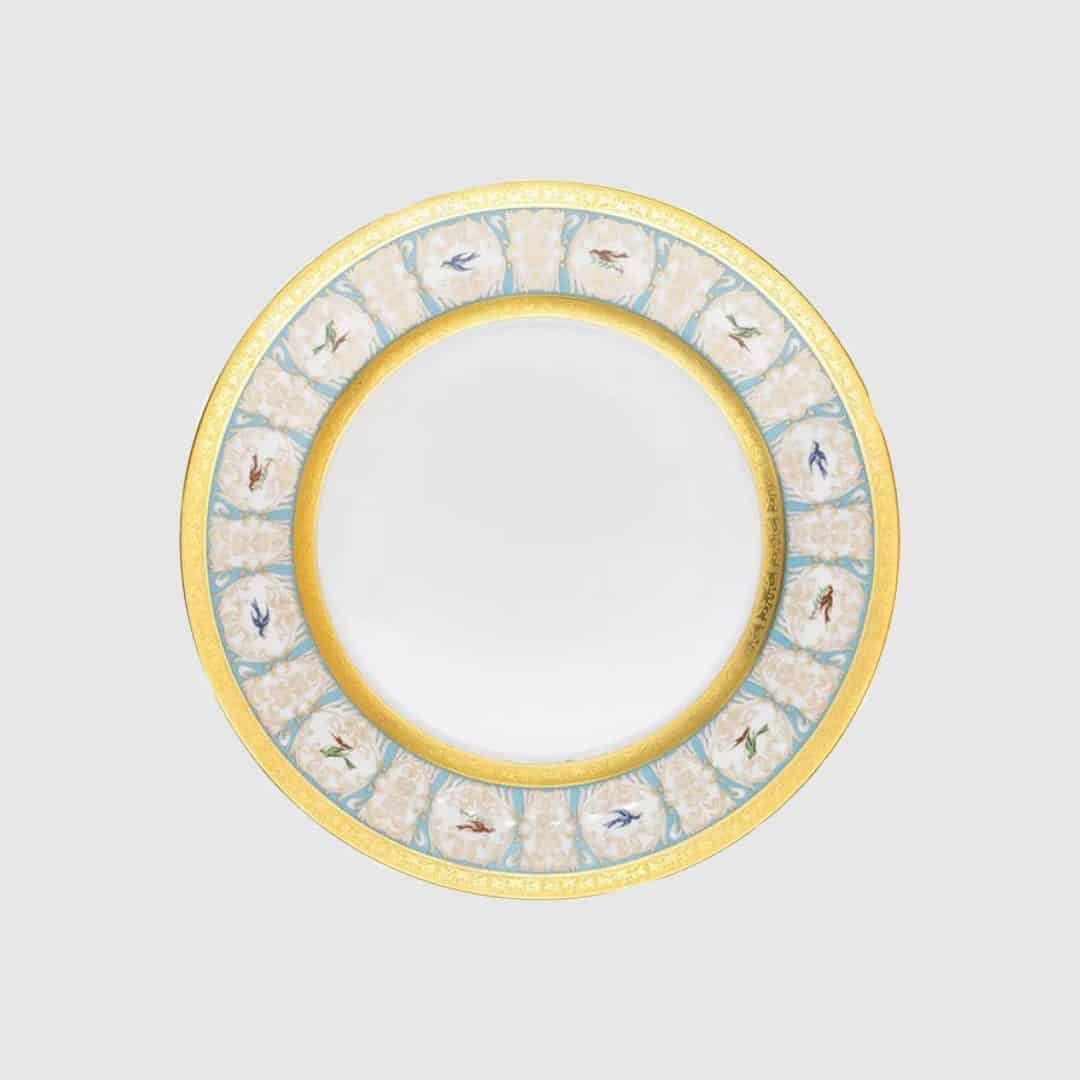 Des formes organiques, comme des pétales de fleurs, reprennent des motifs figuratifs. Les verres sont travaillés dans un style baroque et coloré. Des liserés d’or et de couleurs souligneront les assiettes.