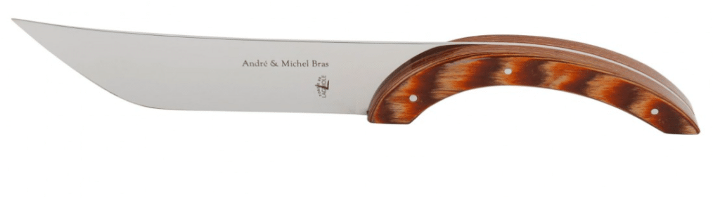 Créé par les frères Michel et André Bras pour Forge de Laguiole, le couteau à fromage plein manche en stamina, apporte à la table un équilibre, et au service, une précision inégalée. La forme et l’ergonomie de cette pièce en feront l’allié indispensable des futurs mariés amateurs de pâtes friables ou molles.